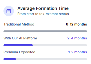 With our AI-integrated platform, the basic formation process typically takes 2-4 weeks. Obtaining 501(c)(3) tax-exempt status can take an additional 1-3 months with our Professional package, or as little as 3-6 weeks with our Premium expedited service.