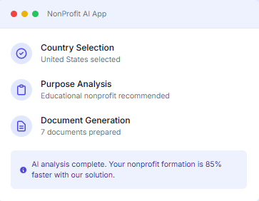 Our advanced AI platform streamlines the nonprofit incorporation process across multiple jurisdictions, ensuring compliance with local regulations.