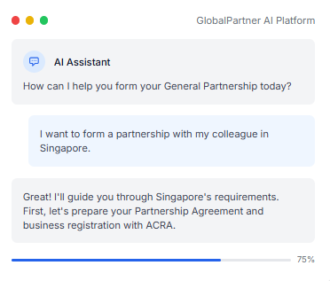Our AI-Integrated Platform analyzes your business needs, local regulations, and partnership requirements to generate customized formation documents. It streamlines the entire process from document creation to filing with relevant authorities, ensuring compliance with local laws while saving you time and reducing errors.
